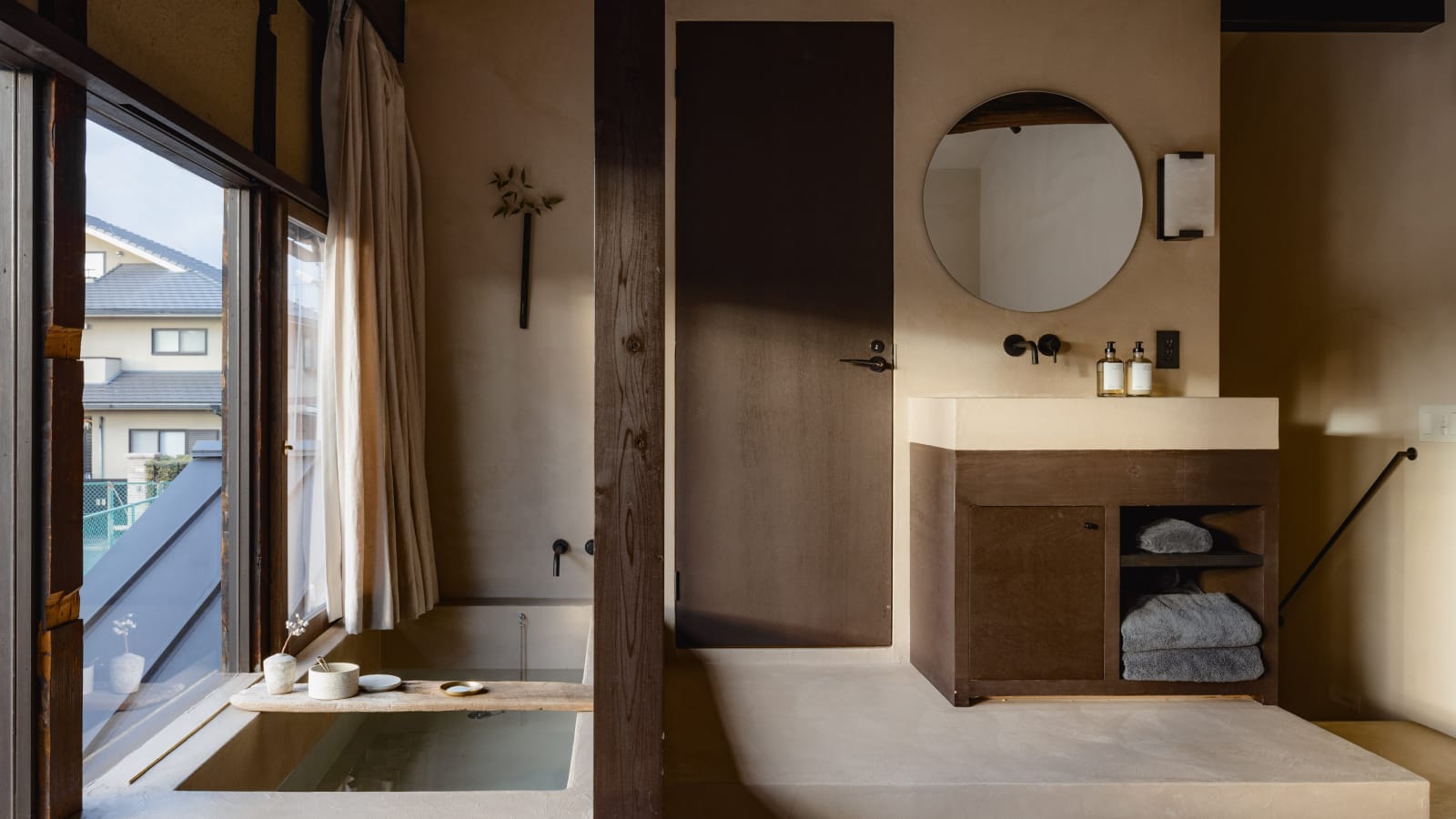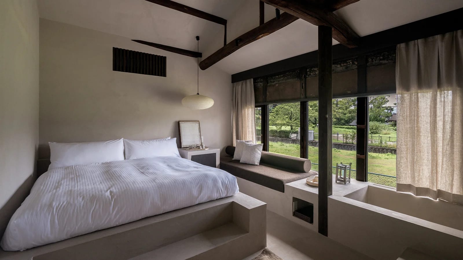 Intimate studio suite on the second floor above our cafe, accessible only by stairs. Thoughtfully designed with a minimalist open layout, it features a deep soaking tub and sofa with views of peaceful greenery and the charming thatched rooftops of Toyokuni Shrine.